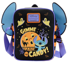 This trickster is ready for a sweet treat! Unwrap some festive fun with the Loungefly Lilo and Stitch Glow Halloween Candy Cosplay Passport Bag. On the front zipper pocket, Stitch grins down at a pumpkin-shaped basket filled with treats. Up above, a witch hat sits between his ears. Turn down the lights to see spooky, glow-in-the-dark details come to life! On the back of the bag, Stitch says the phrase “Gimme candy!” while visiting some friendly haunts. This confectionary crossbody bag will add extra flavor to any outfit and has plenty of room for storing your tricks and treats.